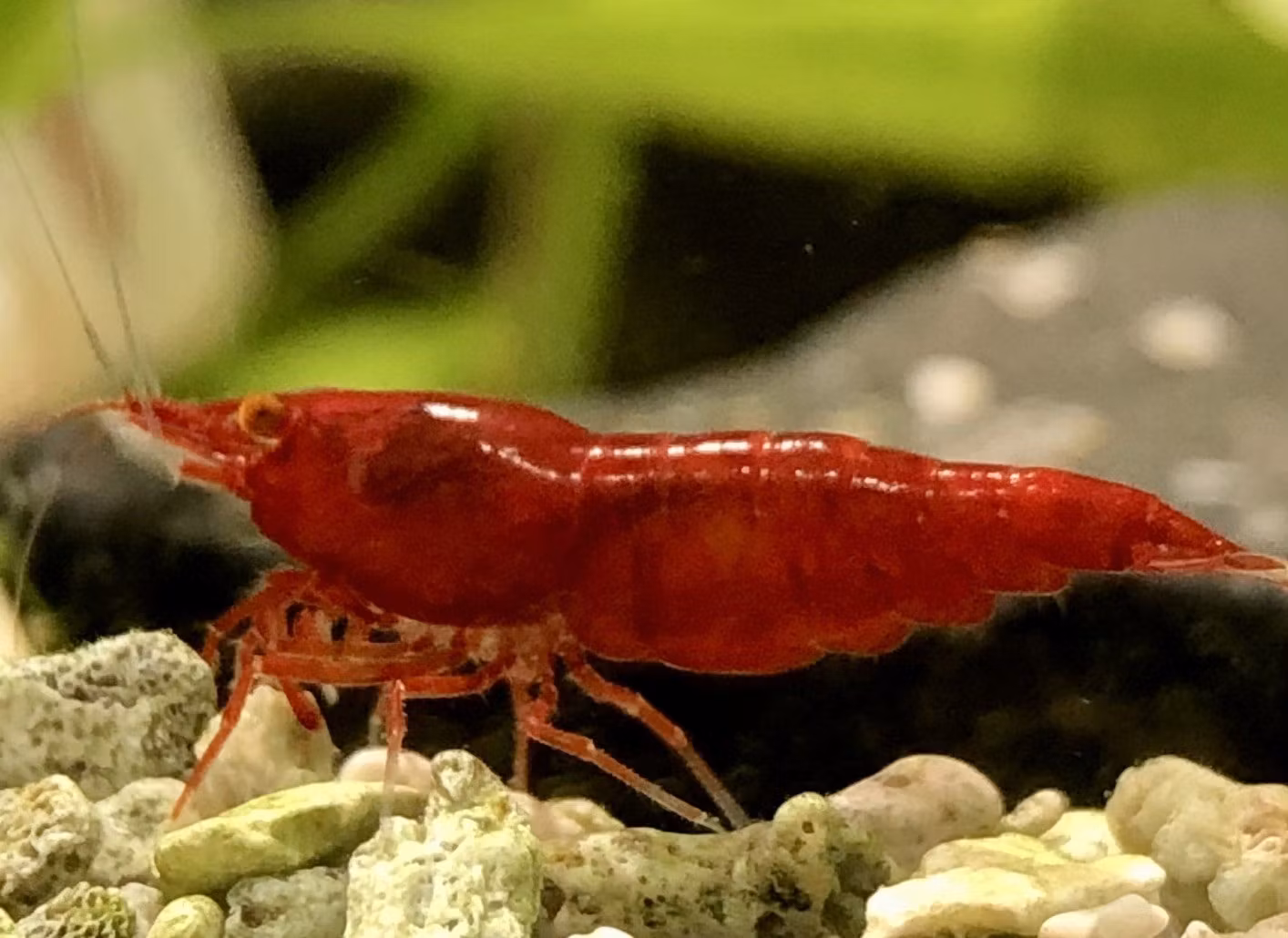 Körsbärsräka OE (orang eye). Slående orangea ögon på denna Neocaridina davidi. Dessa är selektivt odlade Neocaridina davidi, samma art som körsbärsräkor, men där ögonpigmentet har en livfull orange till bärnstensfärgad ton. Resultatet är en unik räka och dessutom i en knallröd kropp.